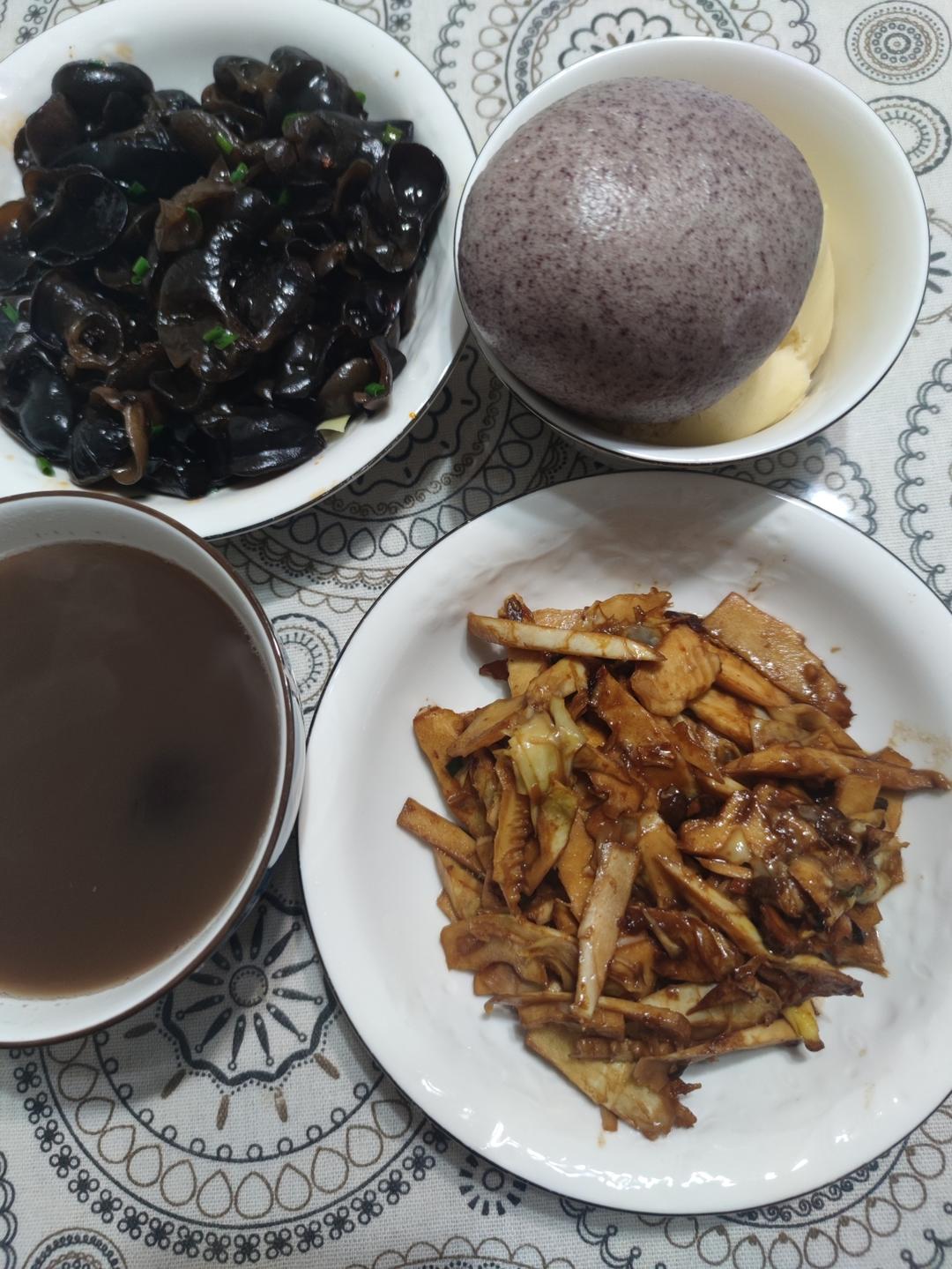 今晚红豆汤窝头,凉拌木耳,红烧春笋。