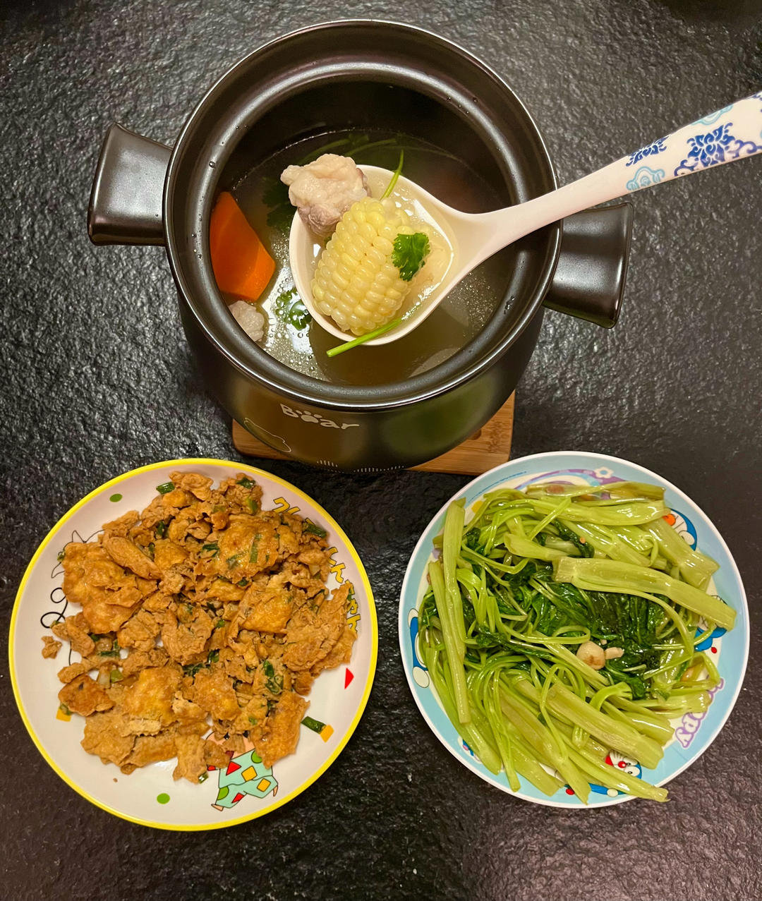 肉沫煎蛋,清炒空心菜,玉米排骨汤