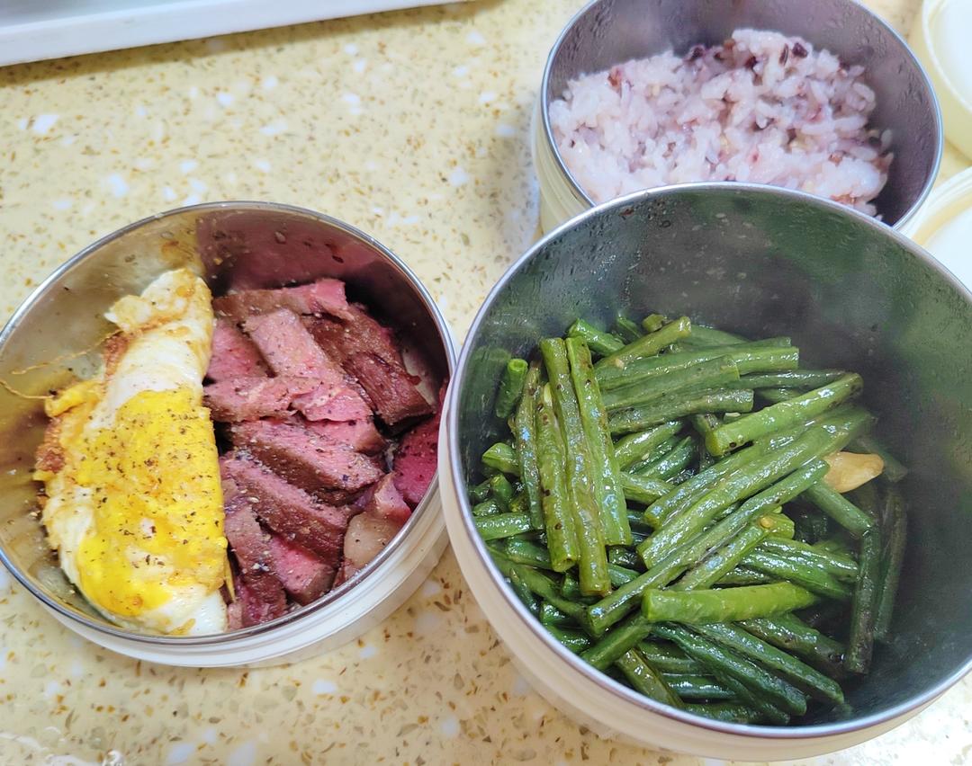 煎蛋,牛排,烧豇豆,