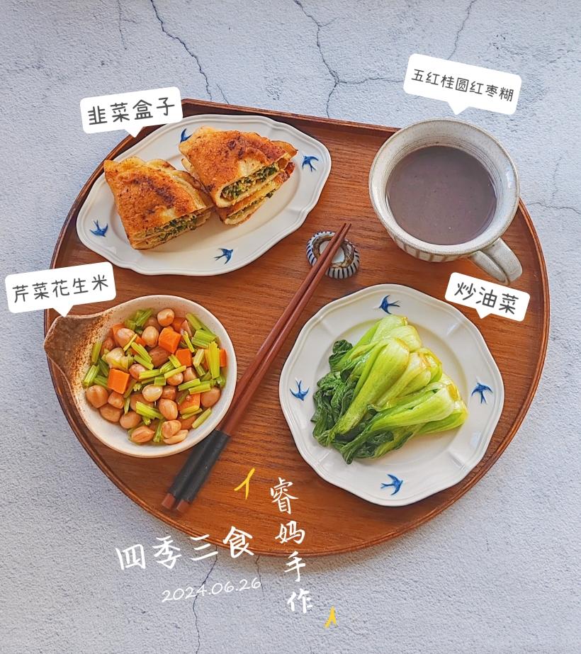 韭菜盒子,五红桂圆红枣糊,素炒油菜,芹菜花生米