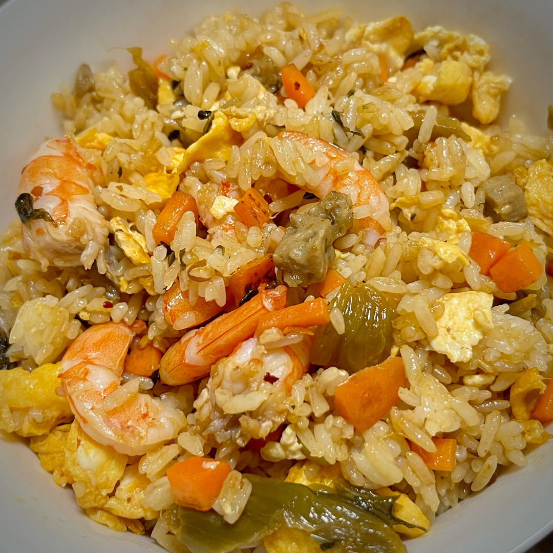 虾处理腌制,鸡蛋打散加盐,胡萝卜切丁焯水,米饭一勺生抽半勺油拌匀,少许酸菜