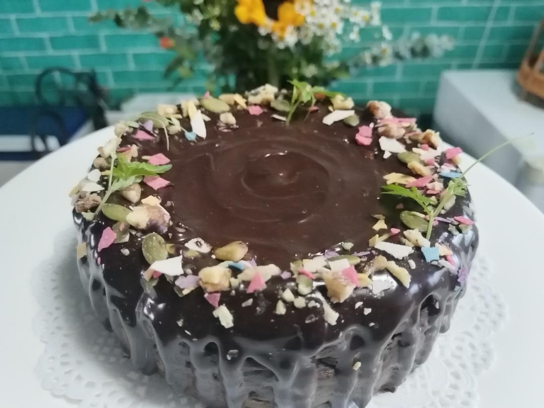 没有可可粉,做了抹茶的,上面淋了甘纳许,点缀了些许果干加巧克力。个人很满意哈哈哈哈