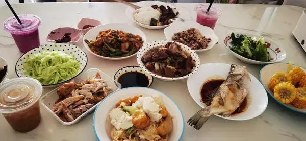 周日午餐:蒸鲈鱼,豆角炒卤水猪耳,手撕鸡,黄瓜丝,牛杂,烫牛肉,水煮豆制品及青菜,果茶。