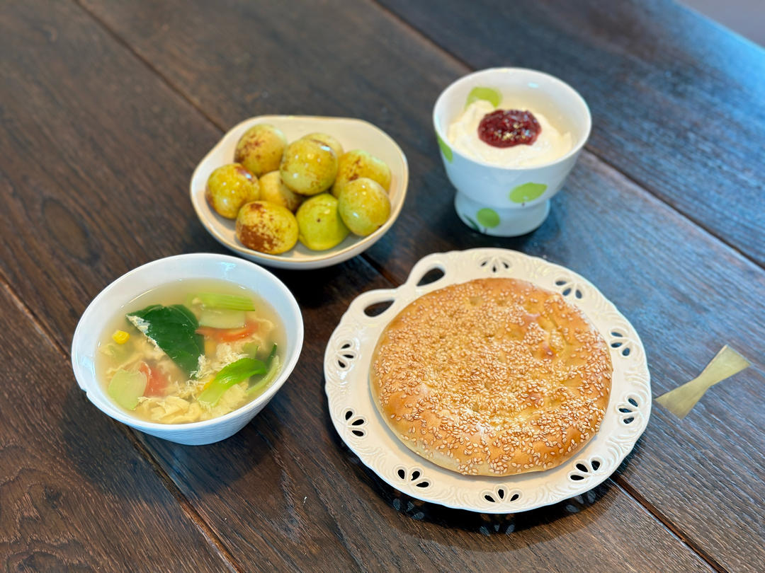 牛乳馕、蔬菜蛋汤、酸奶、水果
