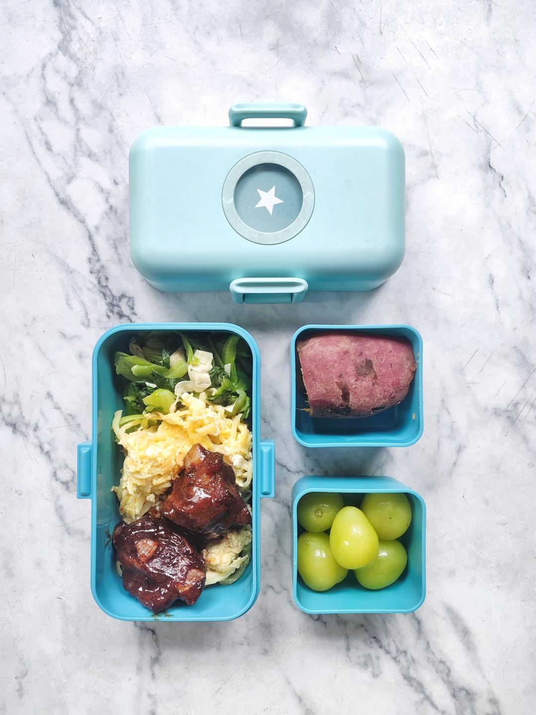今日便当:青菜炒百叶+茭白炒蛋+红烧排骨+蒸红薯+青提~~