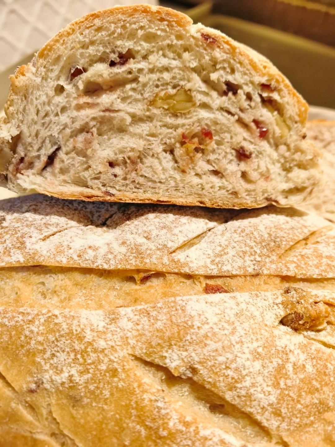 二刷了,太好吃了,有一点点微微甜,蔓越莓果干的甜味,全麦的麦香,很松软,特别喜欢里面的核桃仁。是我喜欢吃的