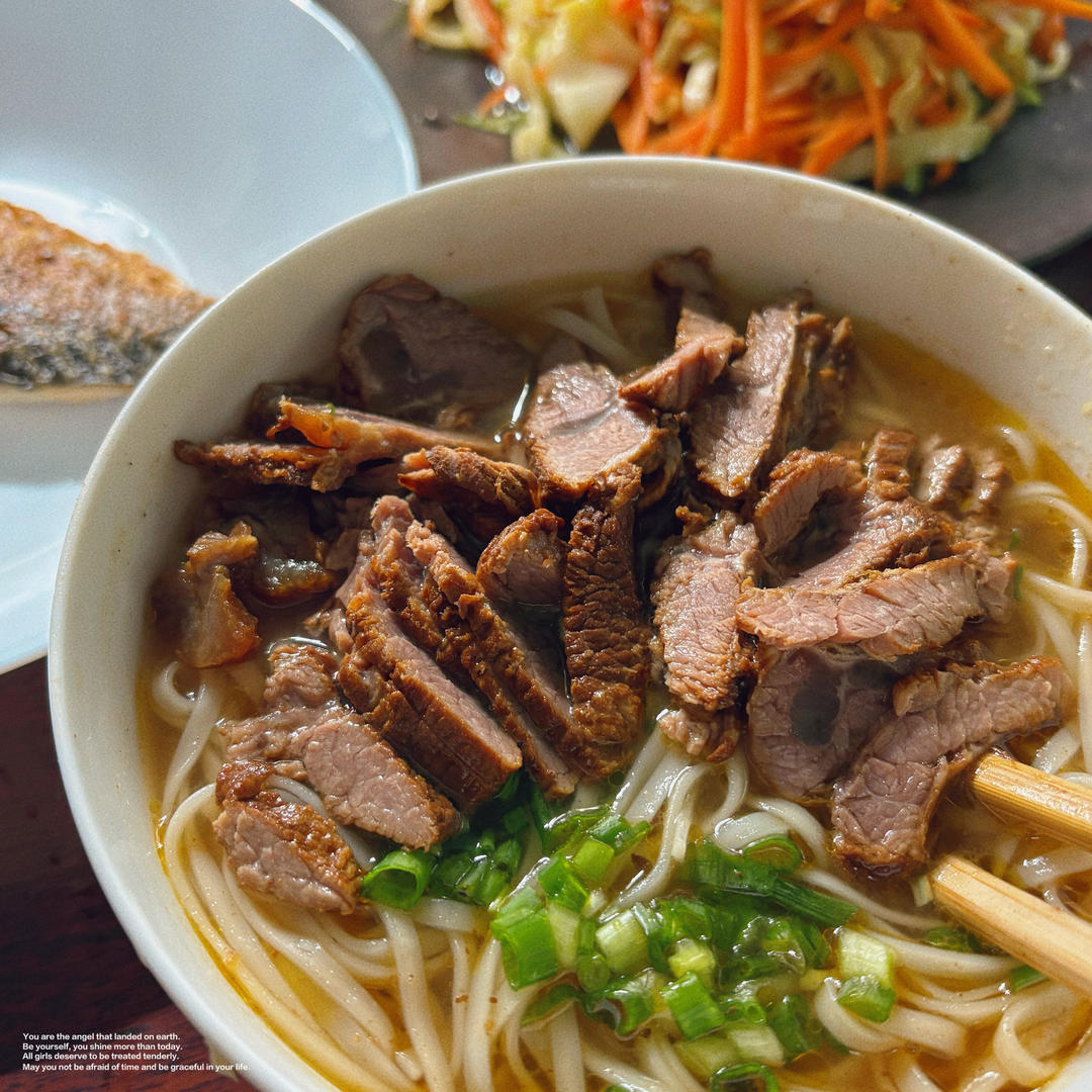 牛肉面、包菜炒胡萝卜丝,煎青花鱼。昨晚牛肉卤得太好😀