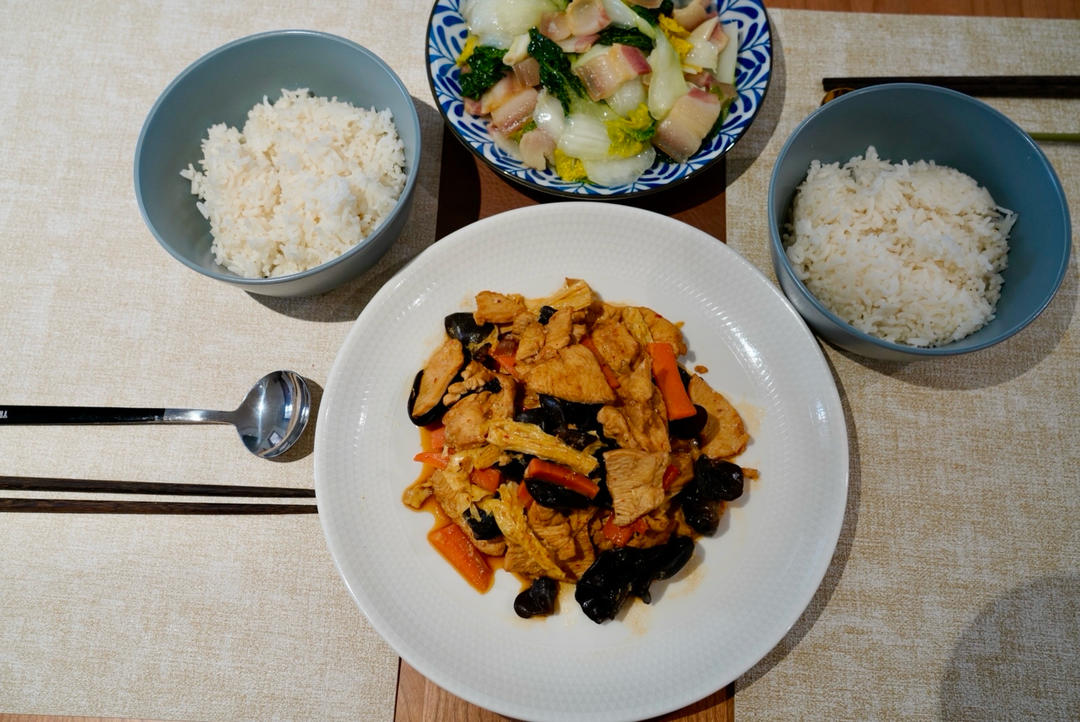 幸运晴天 做过 鸡片木耳烧腐竹 鸡片木耳烧腐竹、咸肉炒翻心黄青菜+米饭餐桌上射灯不如自然光拍出来理想!勾芡时发现没淀粉了,有点小遗憾,作业有点不太合格了,鸡肉很烂腐竹柔软特美味,谢谢@慧的美食每刻 妹妹的美味食谱!大家周末愉快🌹🍀#午餐•2025年1月18日# 2025-01-18