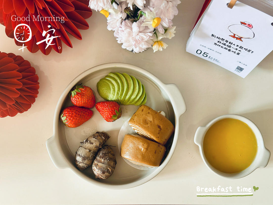 红糖刀切馒头+芋艿+牛油果🥑草莓🍓+小米南瓜粥