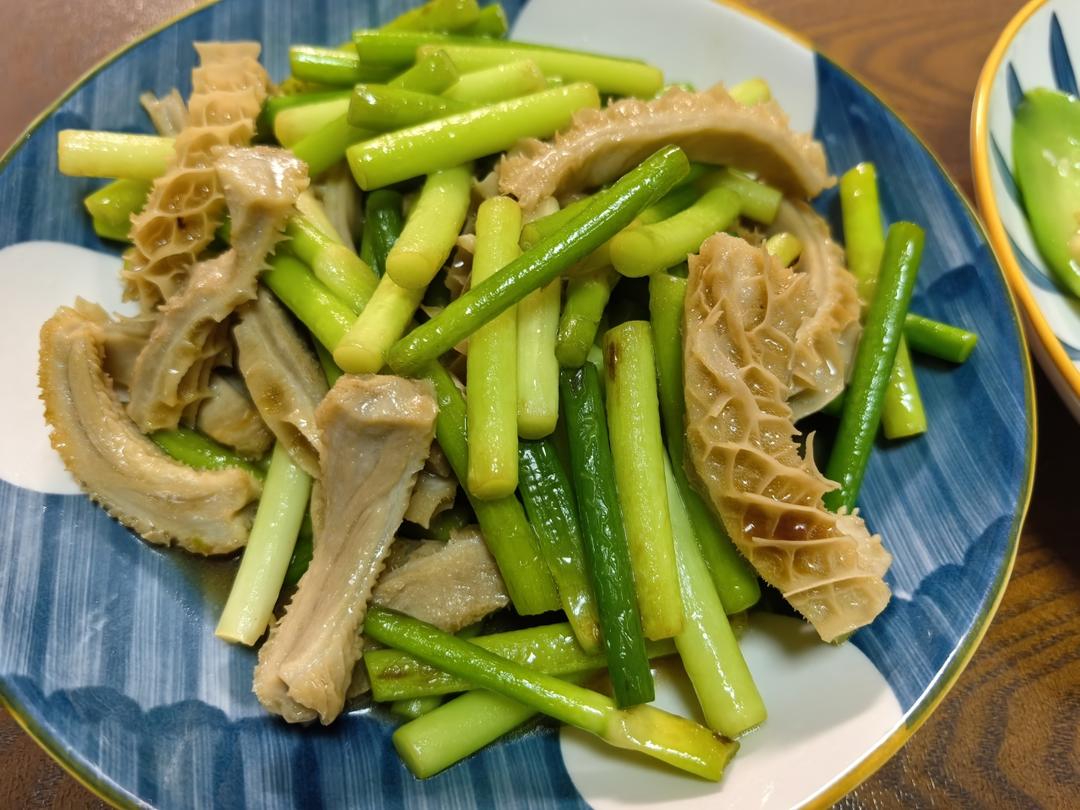 金钱肚提前高压锅压上气15分钟,切条备用;蒜苔切段,热锅热油放蒜瓣爆香,加入蒜苔淋一圈水防焦和保持水分,加入盐巴蚝油鸡精快速翻炒,出锅。
