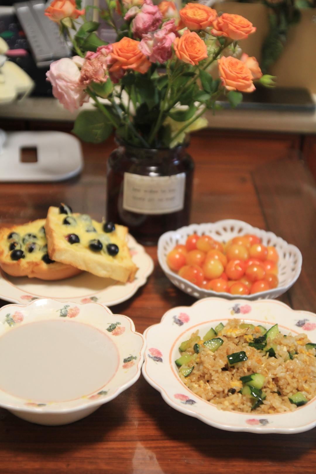 阳阳灿烂 做过 早餐•2025年6月10日 #早餐•2025年6月10日# 灿烂家早餐 蛋炒饭+蓝莓披萨+黑豆浆+樱桃,小妞想吃蓝莓披萨,把老式面包切切整个简易版,主打一个省时又省力[呲牙]昨晚突然的暴风骤雨,今天温度降了一点,很舒服!早安,周二,高考最后一天了~ 06-10