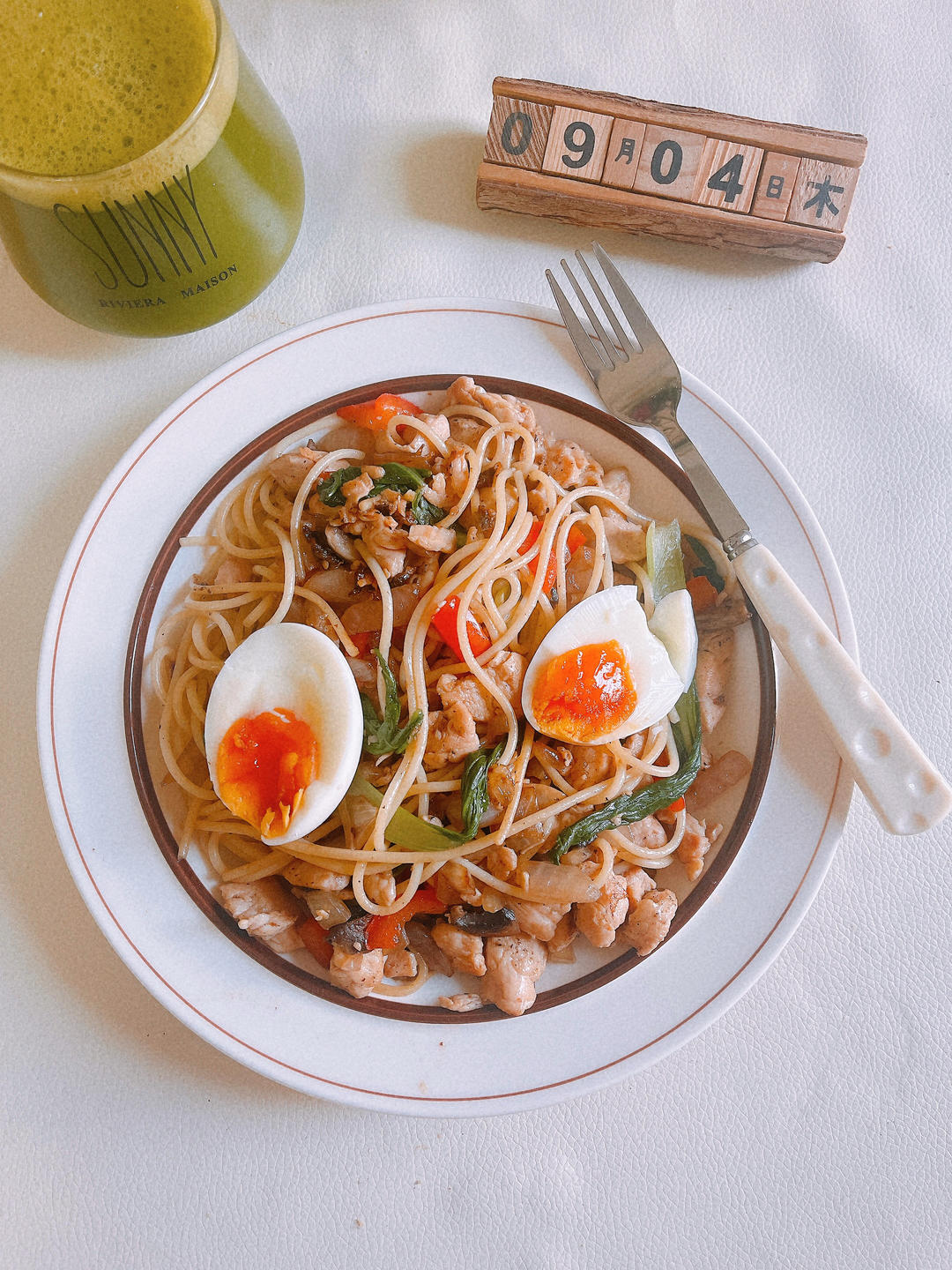时蔬鸡胸肉炒意面,羽衣甘蓝胡萝卜苹果茶🥬🥕🍎🍵