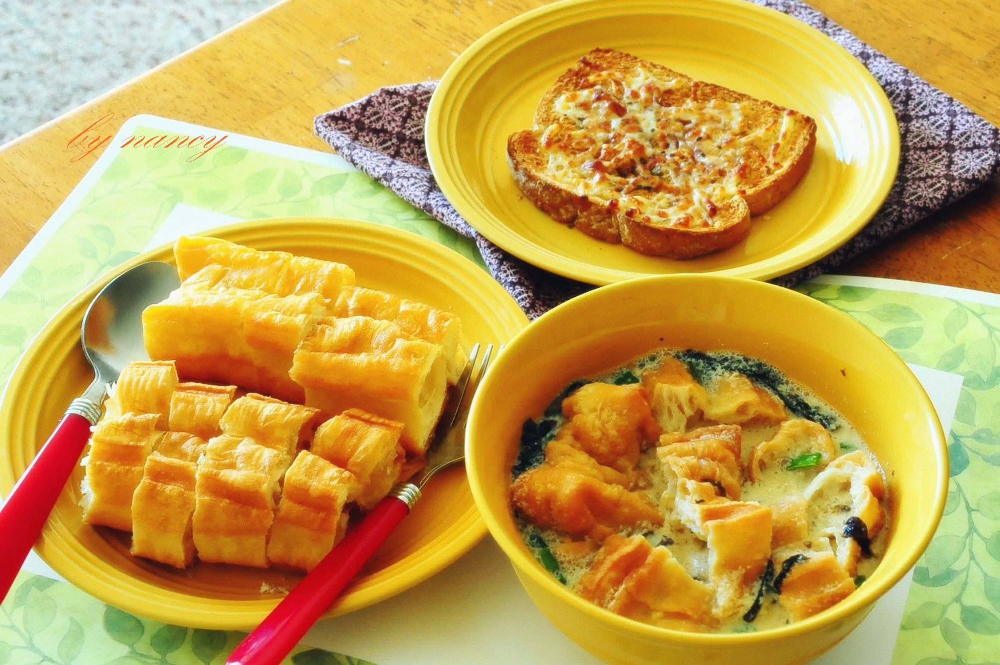今日早餐,咸豆浆泡油条边吃边加,还有一片肉桂吐司pizza~~~好久没有迟到咸豆浆了TAT