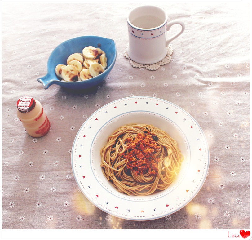 今天的早餐,海苔肉松拌面,香蕉沙拉和养乐多,周末的早晨,岁月静好。