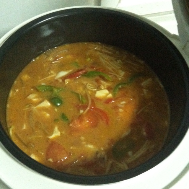 改良版,放了进口椰浆,因为天冷了,老公加班,回来吃肯定冷了,所以牛肉炒好后,把材料在锅里烧开后,电饭煲里炖,卖相是难看点,味道不赖哦