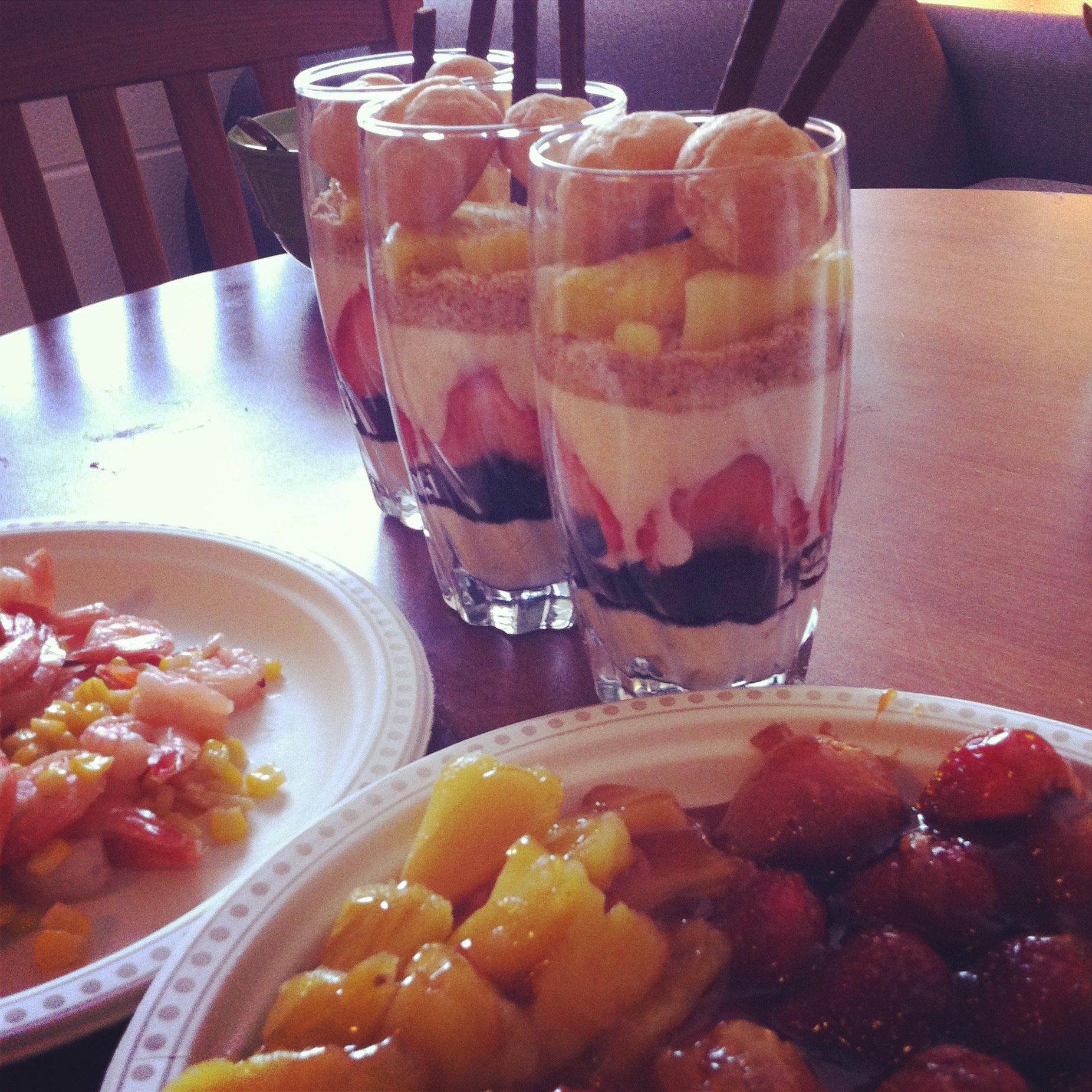 聚餐佳品~一杯下肚饭都不用吃~配水果拼盘和糖葫芦~从下到上:果味酸奶+奥利奥+草莓+果味酸奶+消化饼干+菠萝+泡芙+巧克力棒