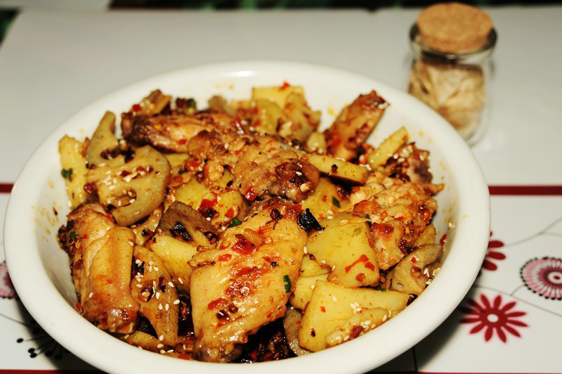 加了很多干辣椒,但是还是觉得不够辣。最后起锅的时候加入了孜然粉。素菜除了土豆还加入了藕片进去。另外,我还是放了很多油,不然全糊锅了。