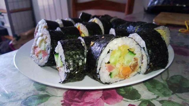 沙拉酱和鱼松搅拌后附着力更强,加了些酸甜的萝卜条,拌饭用的葡萄醋,味道很好,寿司撒点芝麻再沾寿司酱油,味道更鲜香。
