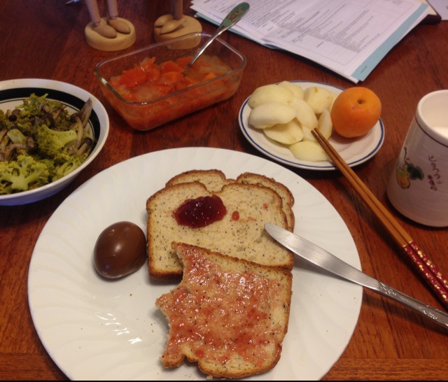 我是你们的钢童鞋 做过 一个人的饮食记录 昨晚又熬夜到2点多 中午才起 来一顿份量超多的brunch 烤吐司 可乐蛋 木瓜银耳 煮过度的西兰花 牛奶 还有梨和杏。。休息两天明天开始忙了 2013-06-17