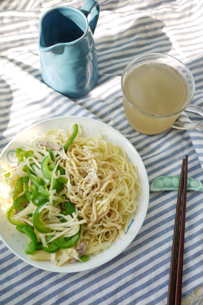 今天的早饭~上海冷面+绿豆汤真是太(╯▽╰ )了 ! 一勺花生酱一勺生抽一勺香醋两勺康乐醋一小撮盐~还有最爱的茭白青椒肉...