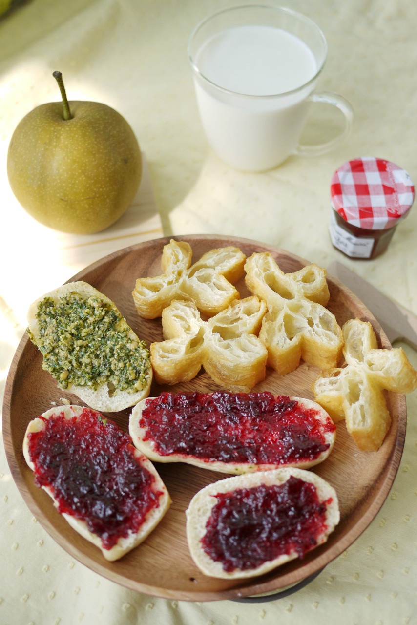 ciabatta抹樱桃果酱和青酱和油条~~其实是前两天吃的忘记发,今天吃的面条和炒菜又忘记了拍!