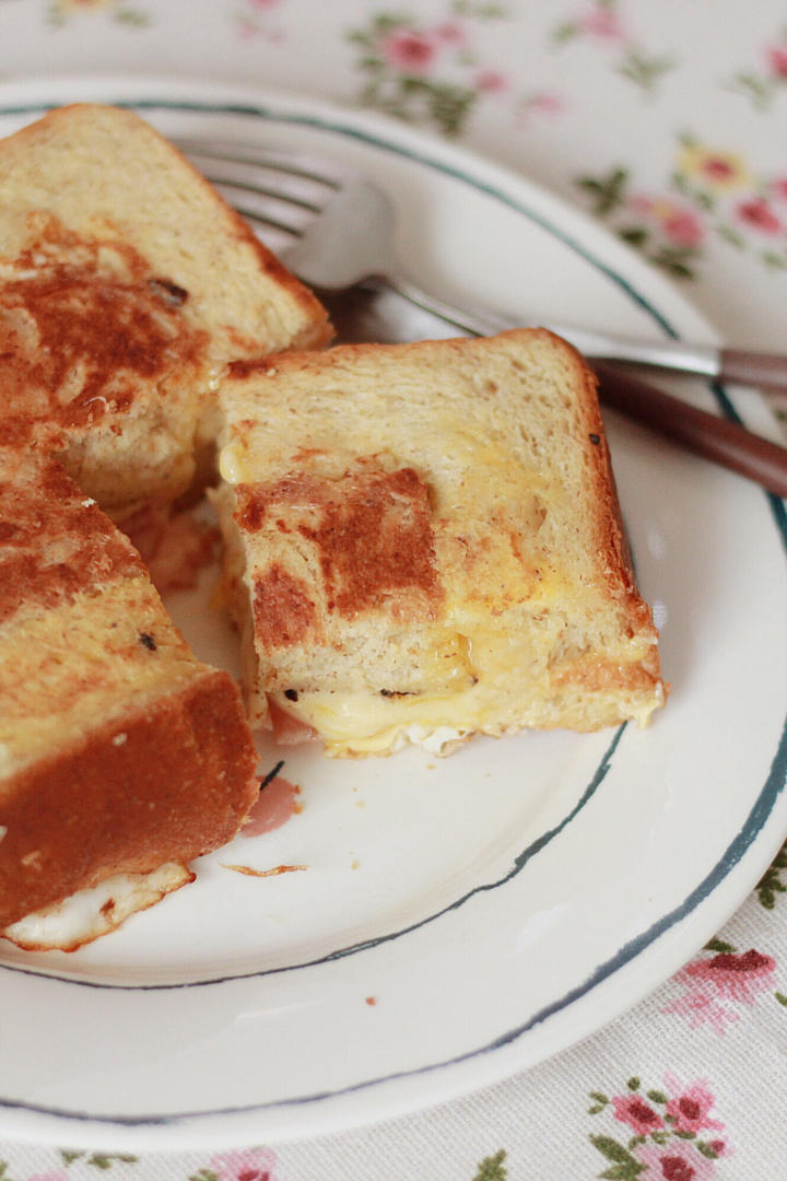 黄油煎的!挖个洞,依次放入鸡蛋液、火腿片、芝士片,再盖回来