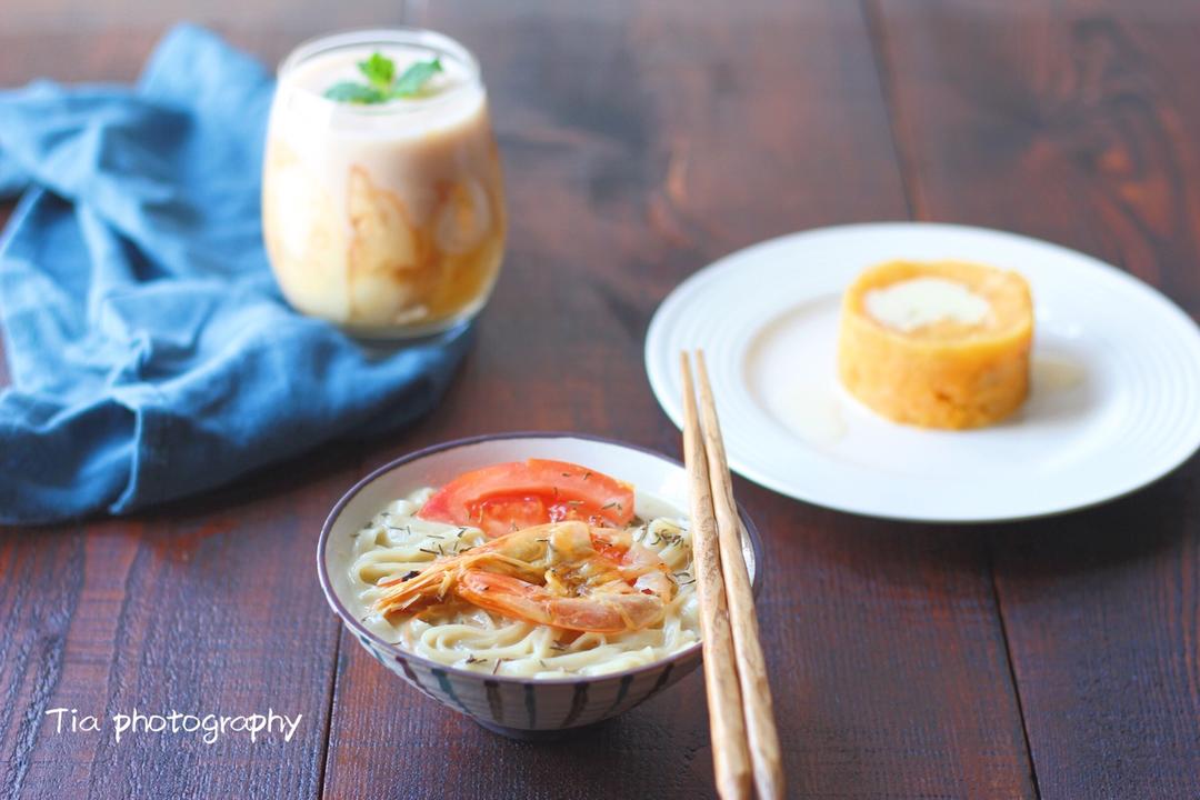 咖喱海鲜面、蒸红薯、水蜜桃山药思慕雪。休息好了元气满满的早...