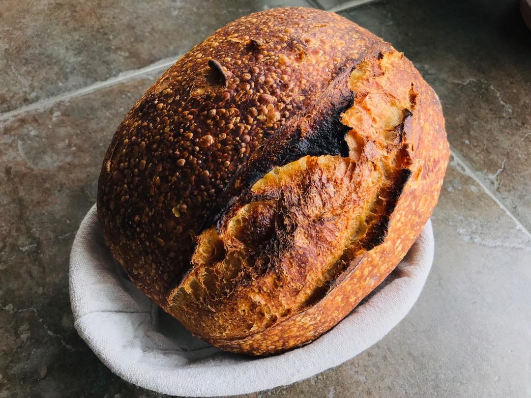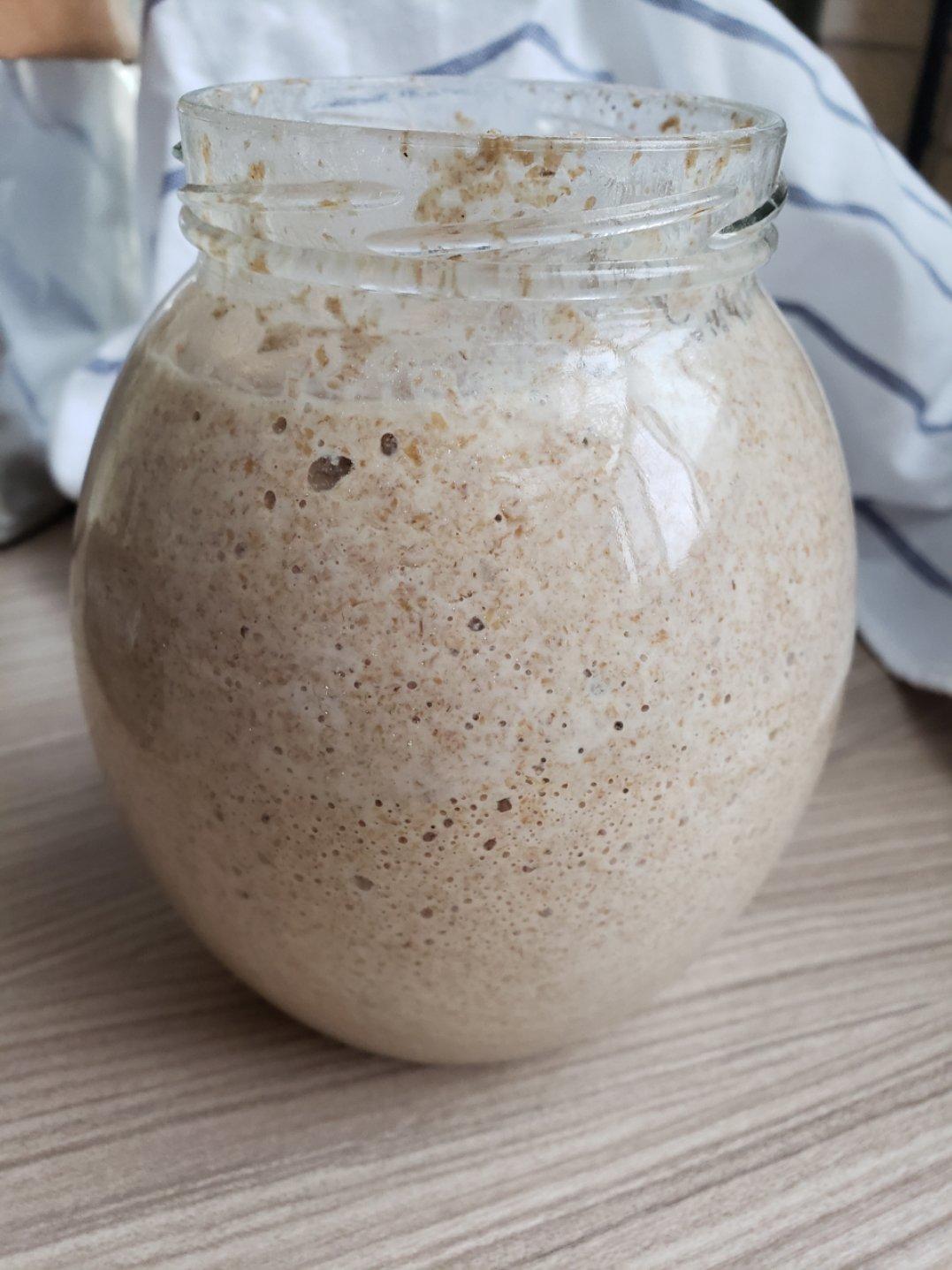 直瓶子已经养不下了,只能换个胖瓶子。😂纯全麦酵种做的欧包好像偏酸了一点,下次用高筋粉混合养试试