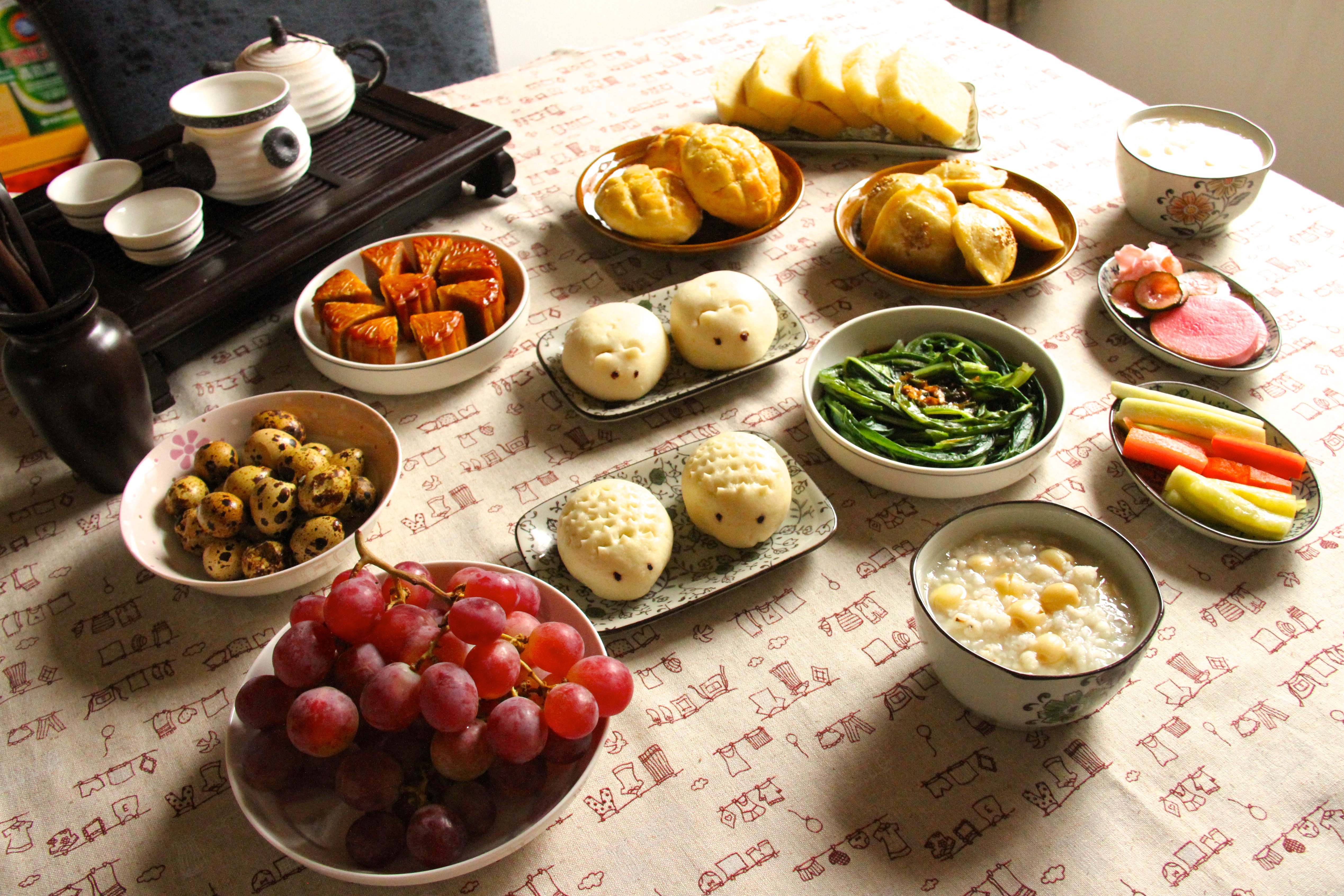 普洱 + 莲子粥 + 马拉糕 + 菠萝包 + 素叉烧酥 + 双黄白莲蓉月饼 ...