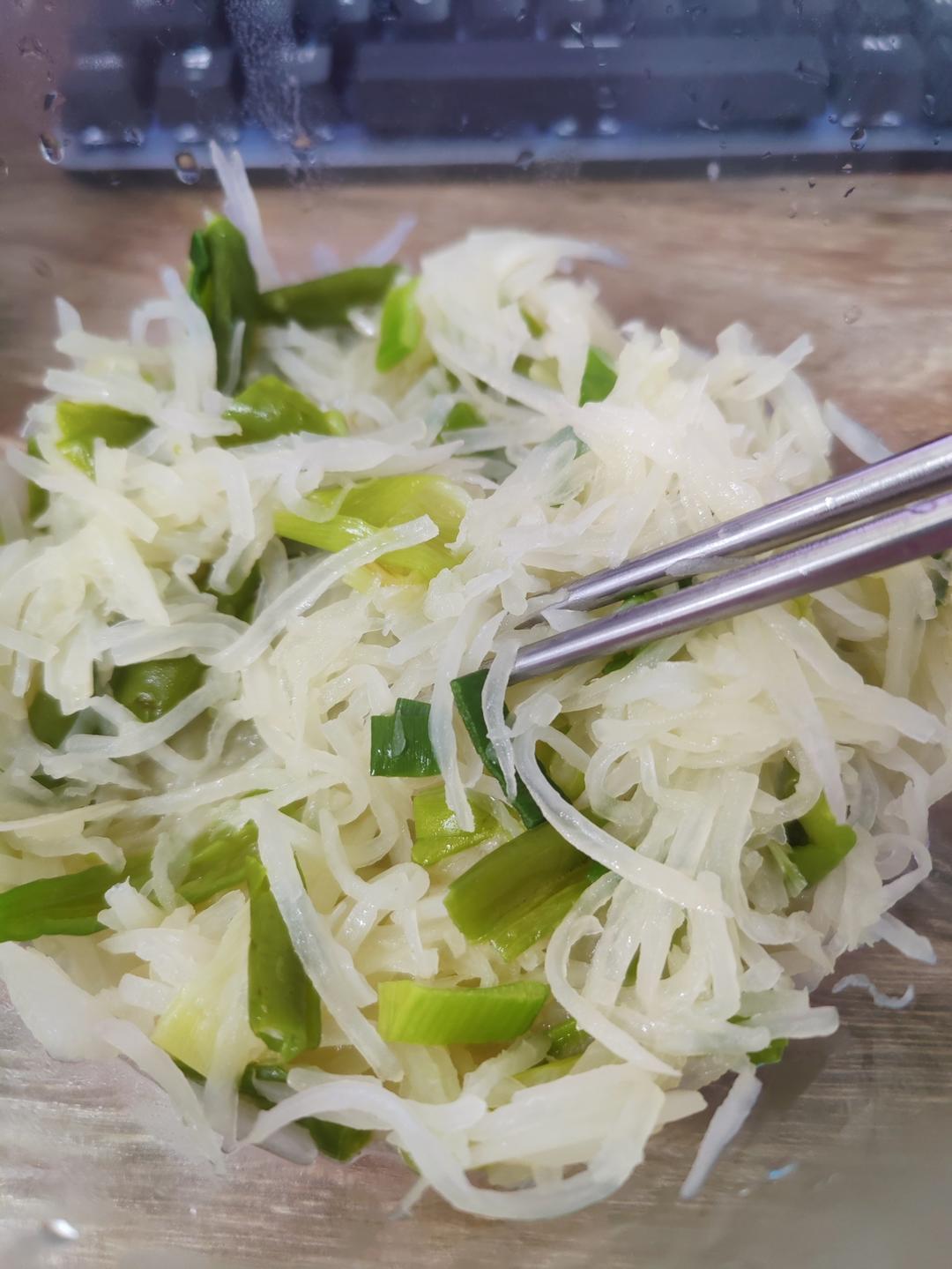 不能说难吃但也谈不上好吃的清炒白萝卜丝。配料是老朋友青椒和大葱,萝卜丝由切丝器帮忙料理,一根白萝卜的份量似乎有点太多了,...