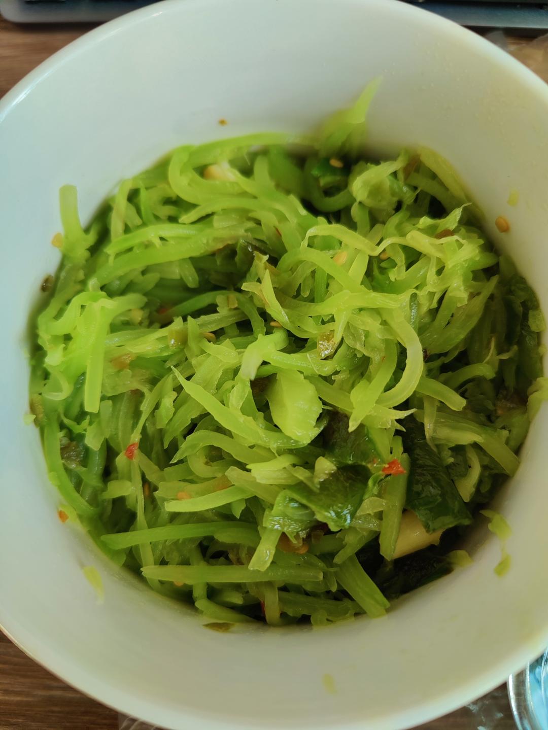 清炒莴笋丝,偷懒用了擦丝器,但是擦出来的丝丝儿大小十分不均匀,而且可能由于部分丝丝儿太小,加上炒的时间稍微长了点,导致出...