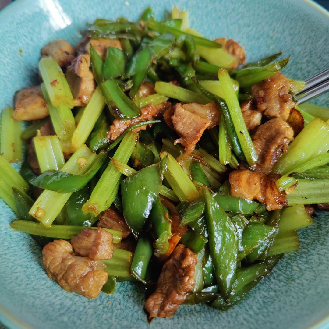 芹菜炒肉,酱油量把握得最准确的一集。先下肥肉煸油,再炒瘦肉,妈妈说如果担心肉粘锅可以撒一点盐,试了下今天果然没有粘锅。配...