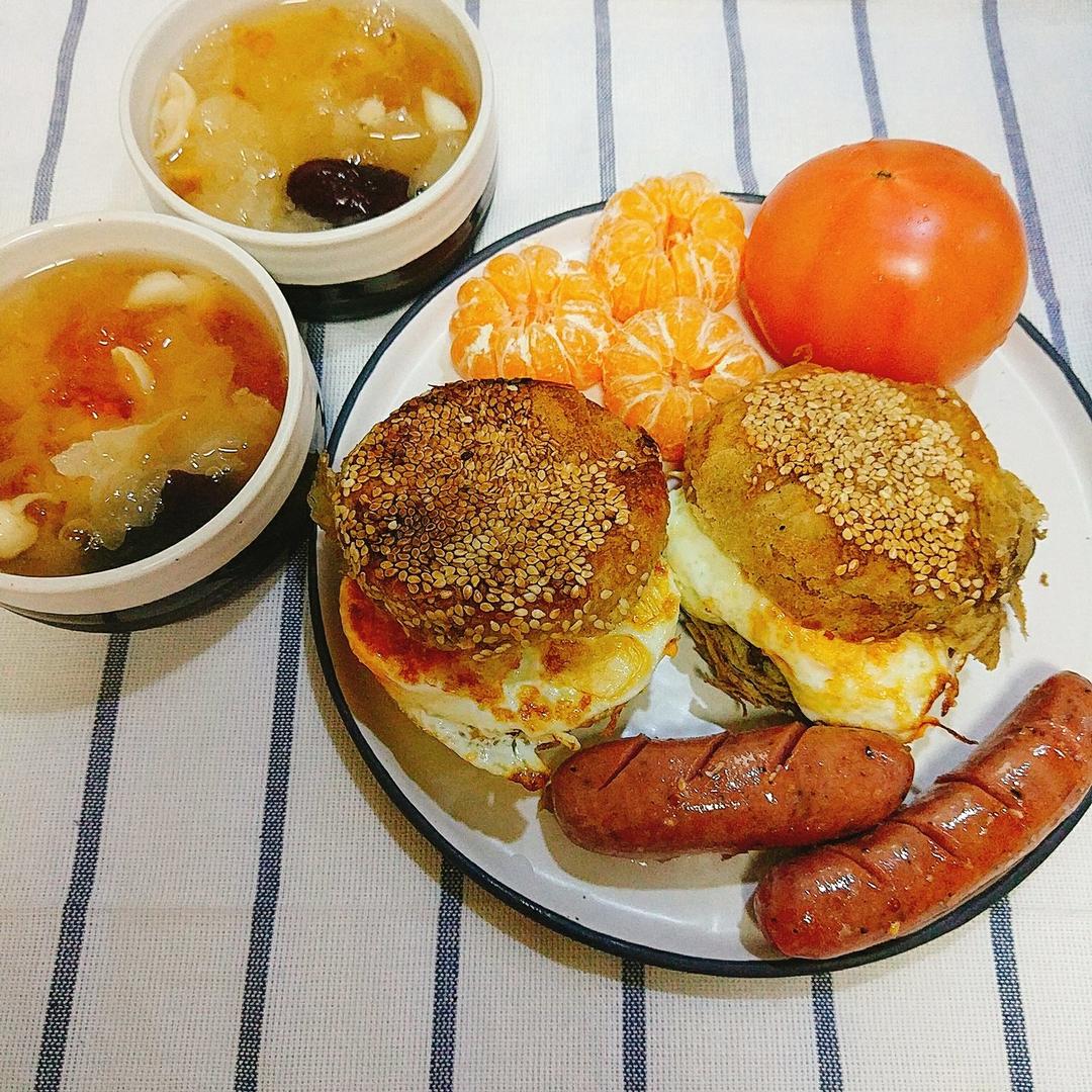 银耳桃胶汤+烧饼荷包蛋+香肠+西红柿🍅橘子🍊