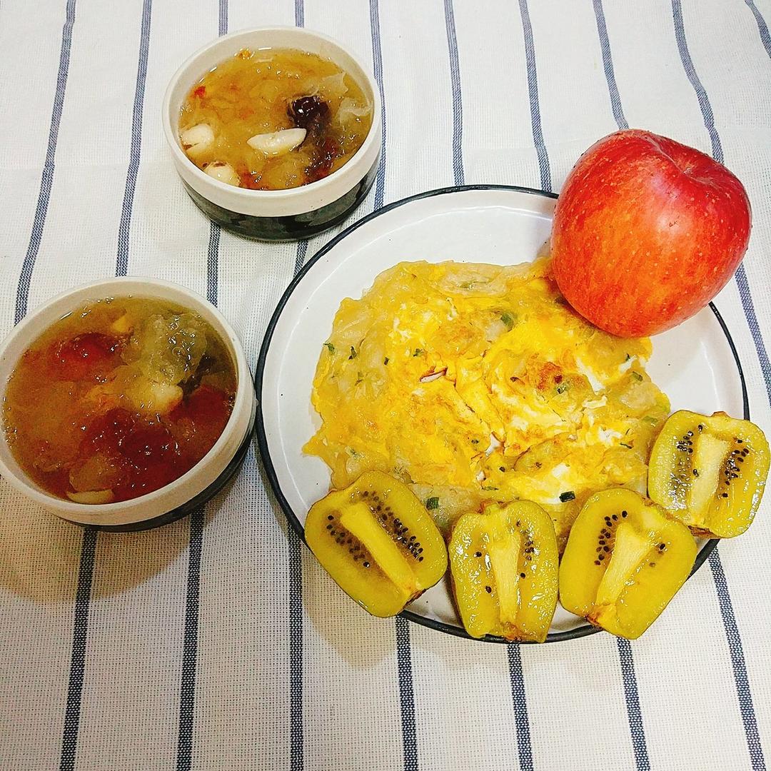 银耳桃胶汤♨+鸡蛋饼+苹果🍎猕猴桃