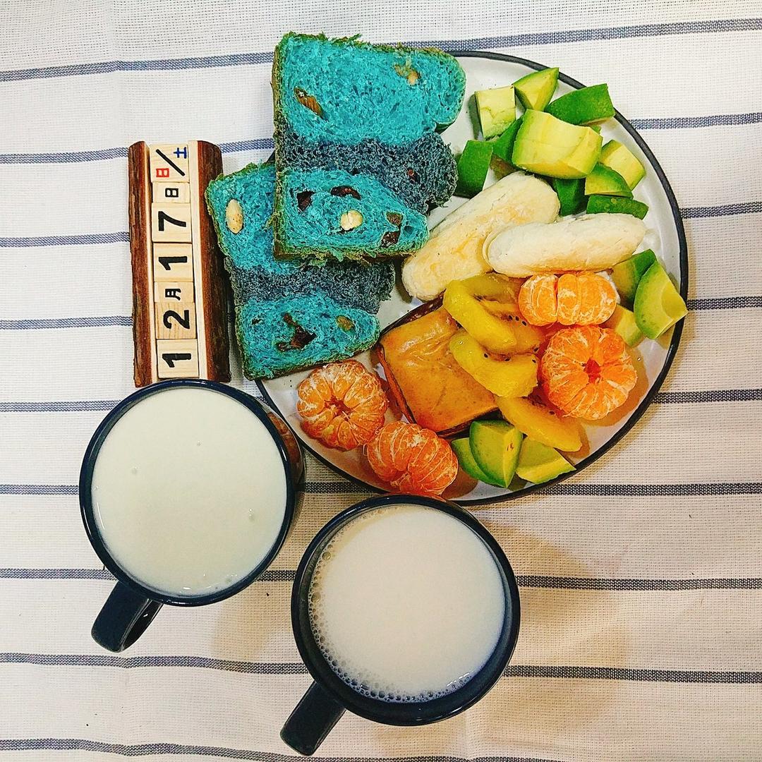 星空土司+牛舌饼+巧克力面包+猕猴桃橘子🍊牛油果+抹茶酸奶+牛奶