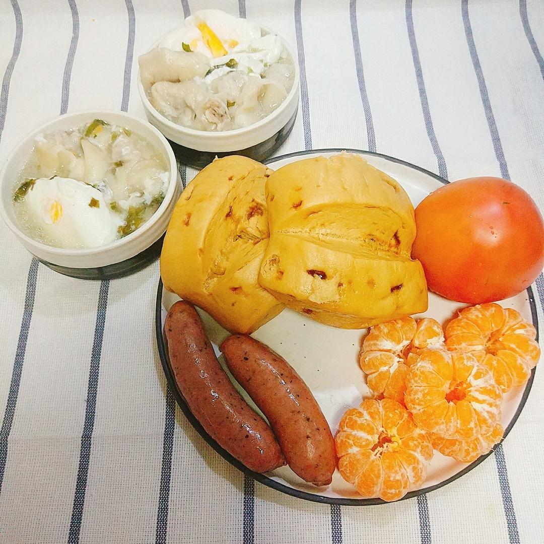 馄饨鸡蛋+红糖馒头+香肠+🍊🍅