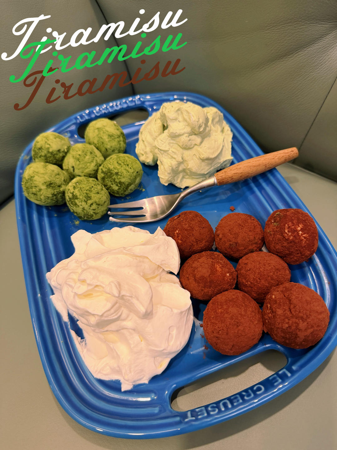 两种口味,咖色是巧克力球配原味奶油,绿色是抹茶球配开心果奶油。
