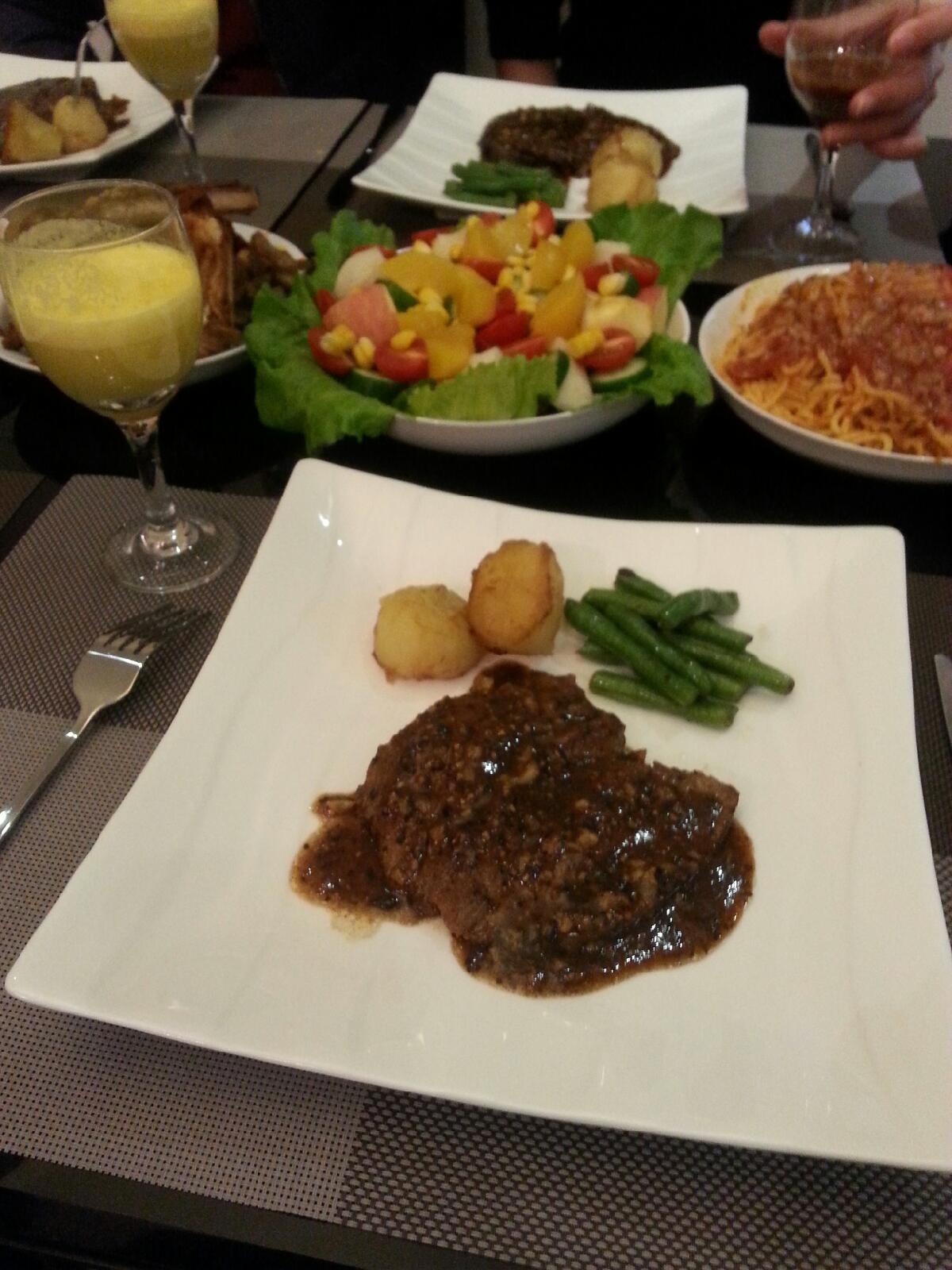 家中自制西餐,黑椒牛排,沙拉,肉酱意粉