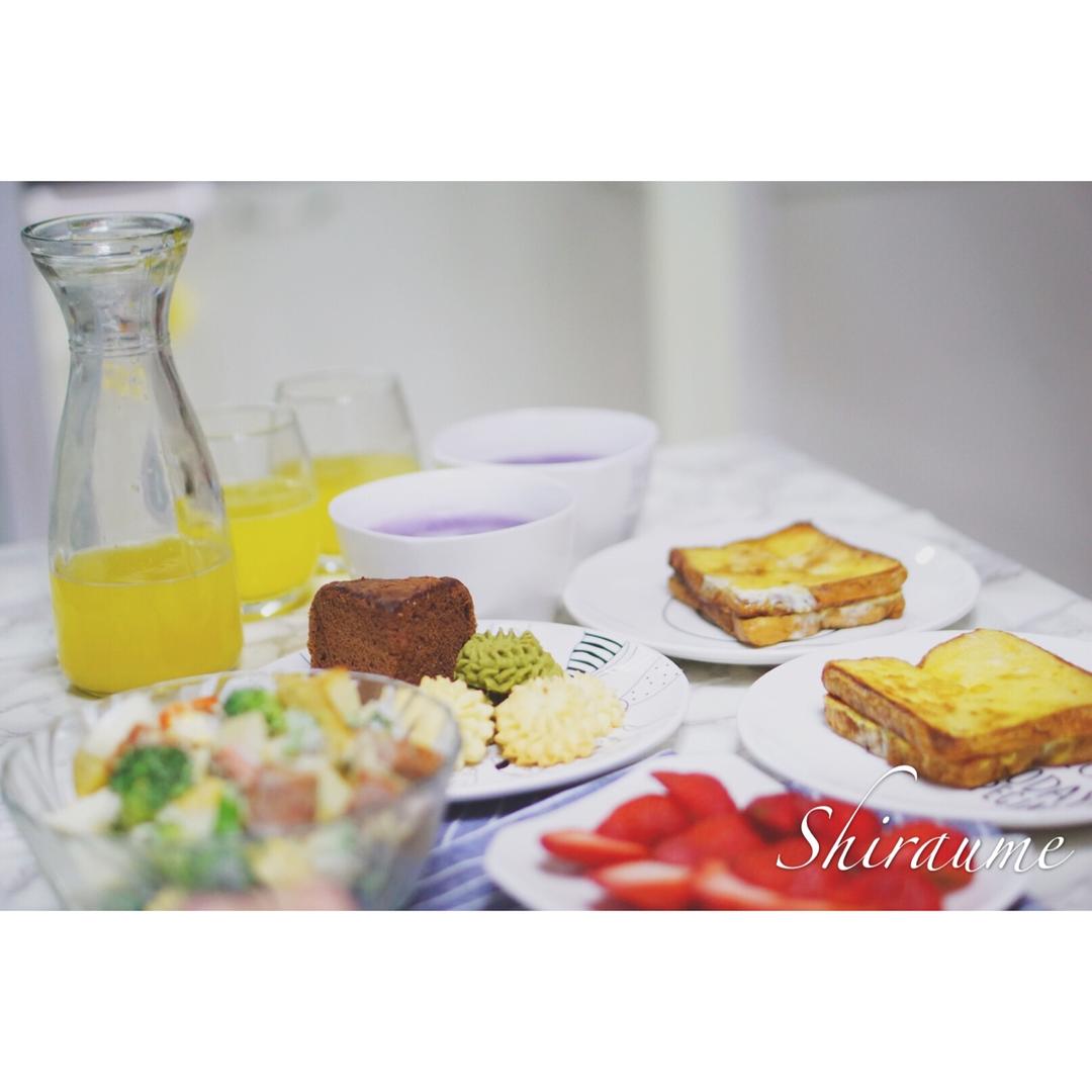 紫薯豆浆,菠萝汁🍍,煎土豆沙拉!剪鸡蛋土司,草莓🍓,可可海绵,曲奇