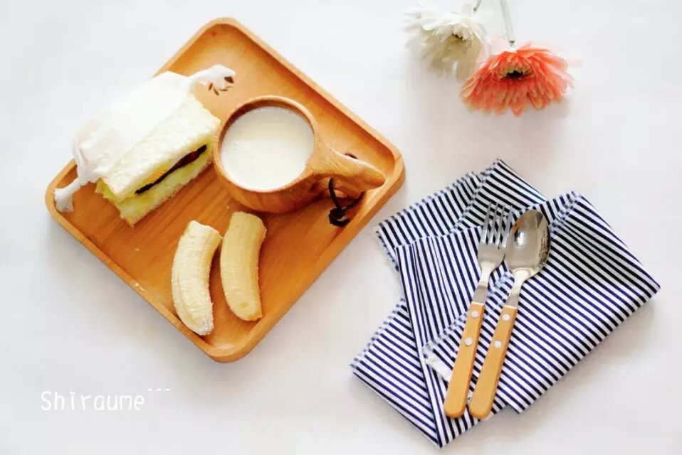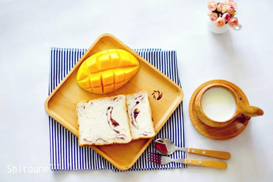 !美好的一天从早餐开始……豆沙土司,芒果,牛奶