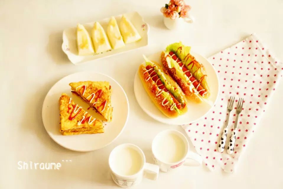 早安!周日!美好的一天从早餐开始…鸡蛋煎土司,热狗,香瓜,牛奶