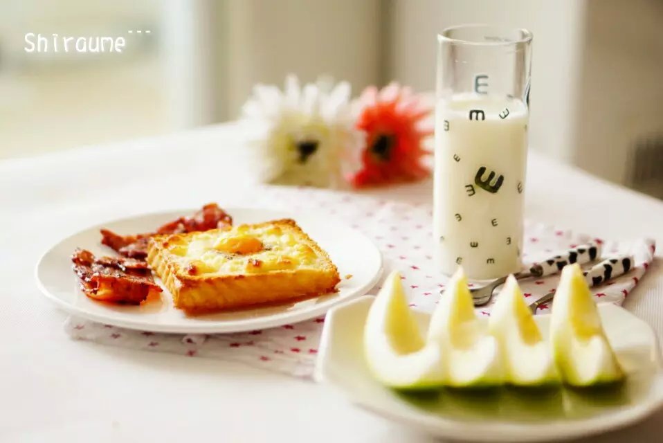 早安!周二!美好的一天从早餐开始﹉鸡蛋芝士烤土司,培根,牛奶,香瓜,