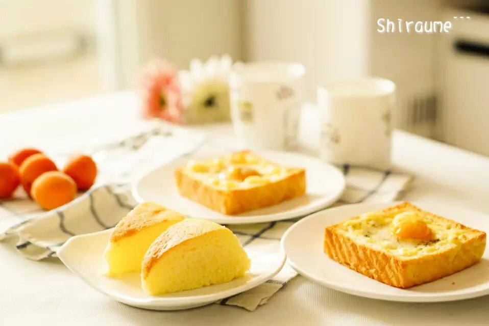 美好的一天从早餐开始……鸡蛋芝士烤土司,酸奶蛋糕,杏,牛奶