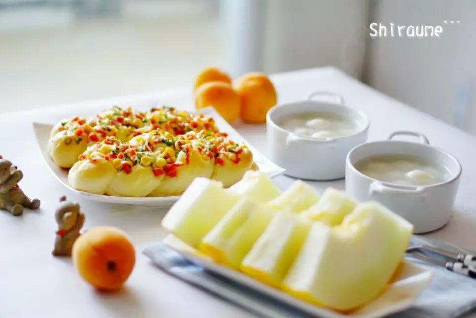 早安!周日!美好的一天从早餐开始……玉米火腿面包 汤圆,哈密瓜,杏