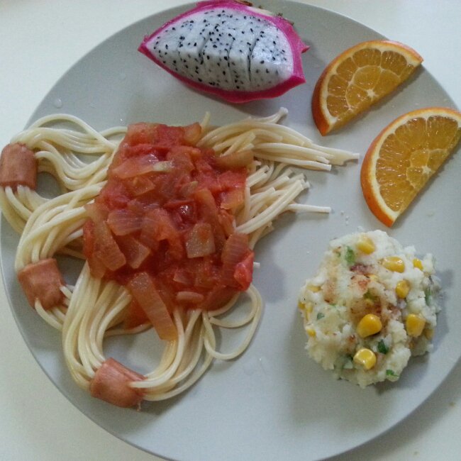 番茄元葱意面。。金枪鱼玉米粒土豆泥。。