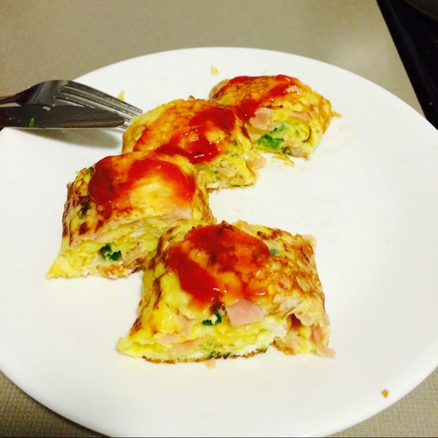 鸡蛋稍微煎过了一点,涂上番茄酱看不出来哇哈哈哈我好聪明!