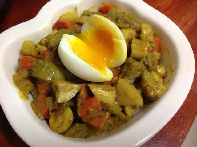 这个是比鸡蛋少的水煮了6分钟的蛋,蛋黄基本没有凝结,配着咖喱吃了