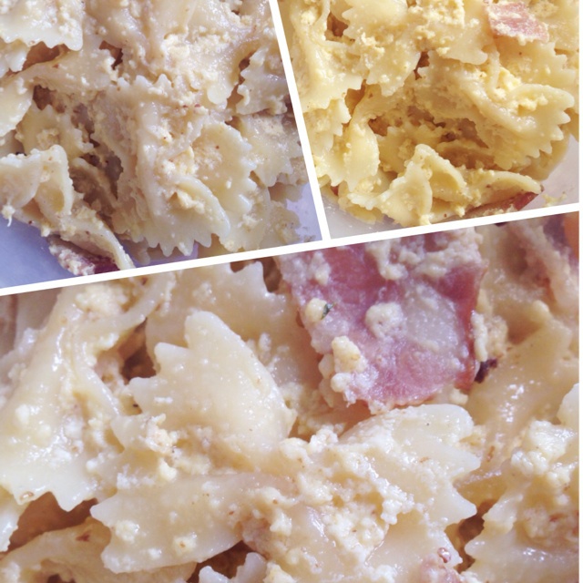 用蝴蝶面做的,怕奶油太腻,就在鸡蛋里加了些水~味道不错~