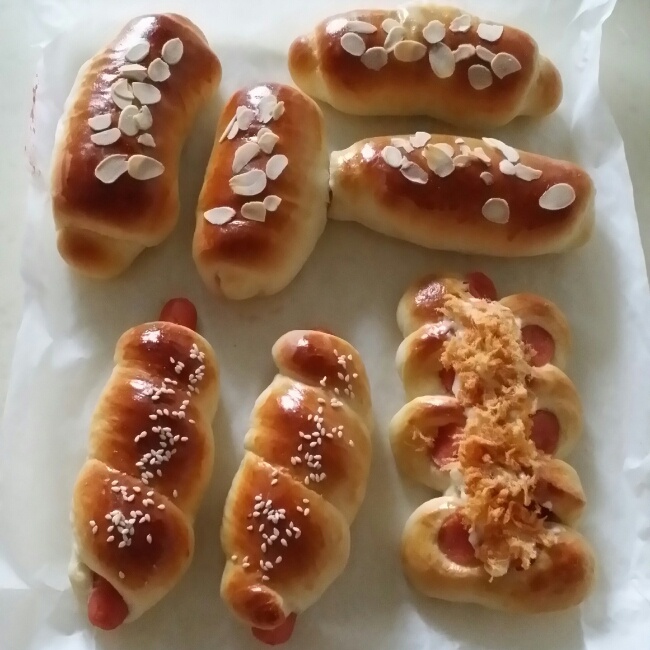 各式面包~四个草莓果酱面包卷,两个热狗面包卷,一个肉松热狗包,把烤盘挤...