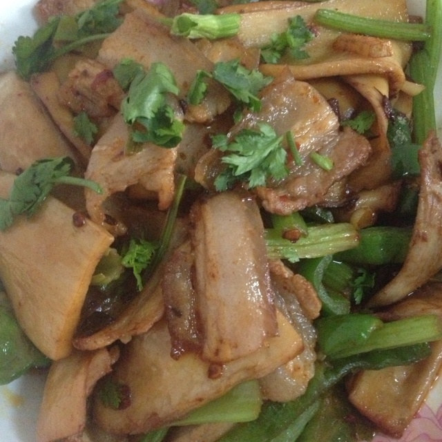 五花肉炒杏鲍菇,必须赞一个!杏鲍菇切片先过下油,另起油蒜爆香炒五花肉然后放青椒,芹菜加郫具...